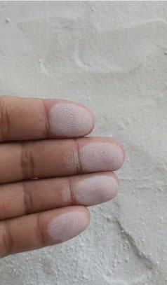 Caleo. La acción continuada del sol sobre las fachadas puede originar que el ligante se degrade quedando la pintura pulverulenta en su superficie y se detecta al comprobar que los pigmentos se eliminan con el frote. Se ha perdido el ligante superficial quedando los pigmentos aflorados y superficiales.