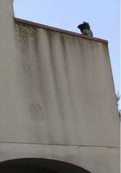 Contaminación. La contaminación está formada por pequeñas partículas de suciedad de distinto tipo que forman parte del aire contaminado, normalmente en ciudades y zonas industriales. Estas partículas se adhieren a las pinturas de las fachadas especialmente si están húmedas o si están reblandecidas. La fachada presenta manchas de color negro o gris oscuro en zonas determinadas perdiendo la pintura su limpieza y aspecto decorativo.